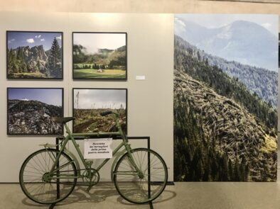Bicicletta da bersagliere di inizio Novecento (METB, Bellamonte – Tn). Fanno da sfondo le fotografie di Stefano d’Amadio dell’esposizione temporanea “Vaia, la lunga notte”.